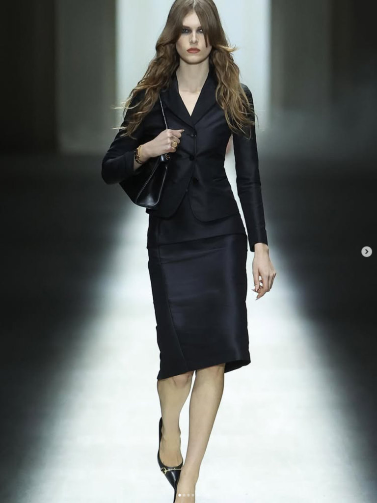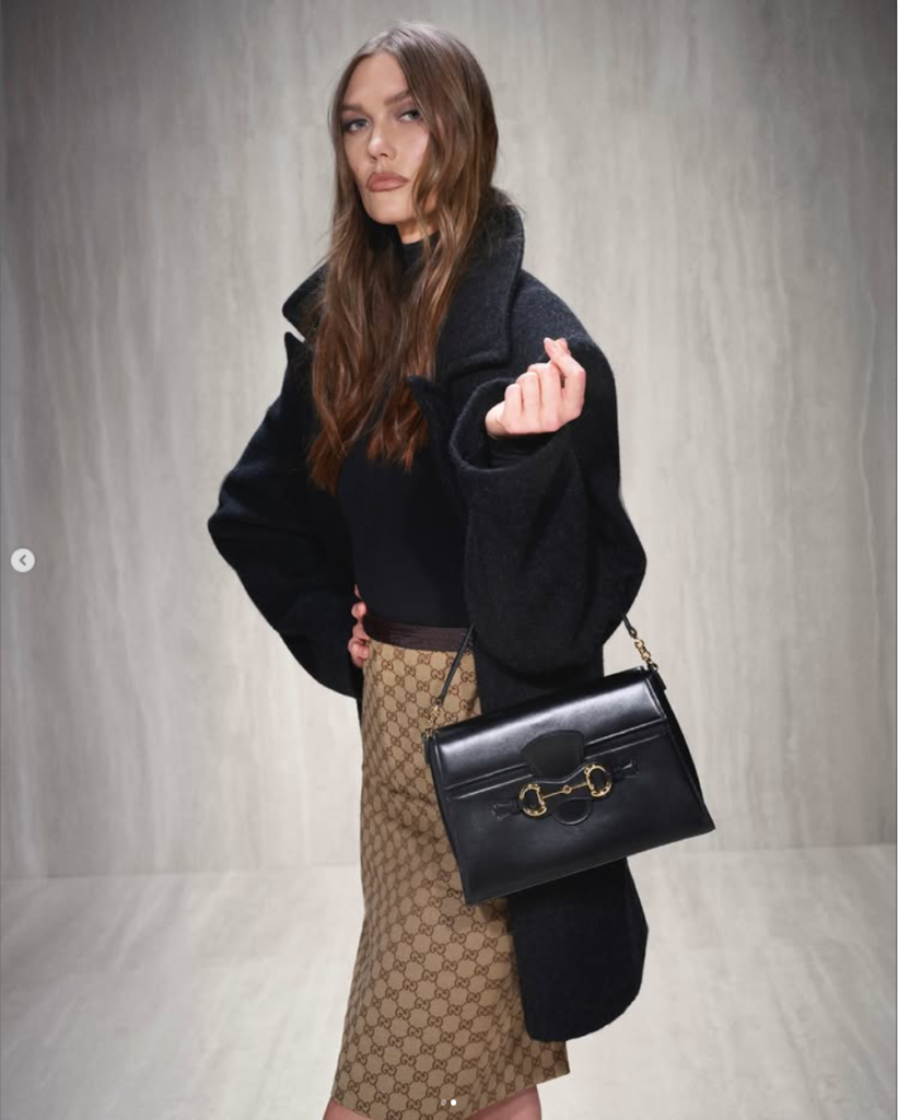 ヴィクトリアズ・シークレットの象徴的モデルであったカーリー・クロスが、2年ぶりにランウェイ復帰を果たしました。黒のハイネックトップスに、オーバーサイズのダークグレーのコートを肩に羽織っています。グッチを象徴するGGモノグラムがあしらわれたベージュのタイトな膝丈スカートを着用しています。