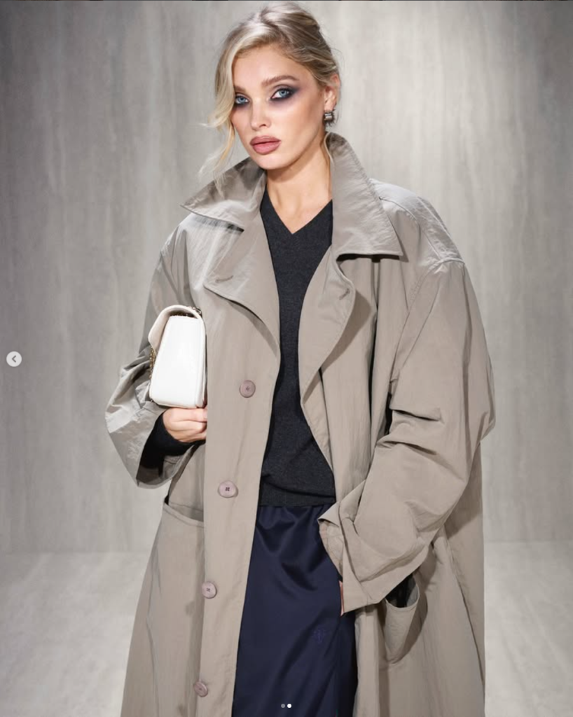 モデルのエルサ・ホスクは、無造作にまとめられたブロンドヘアと、深みのあるスモーキーなアイメイクで登場しています。
