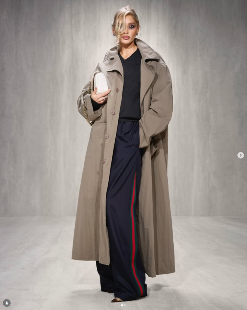 オーバーサイズのトレンチコートを主役にした、現代的でエレガントなスタイリングです。シンプルなブラックのVネックトップスのインナーとサイドに特徴的な赤と緑のストライプ(グッチのシグネチャーであるシェリーライン)が入ったネイビーのワイドパンツを合わせています。
