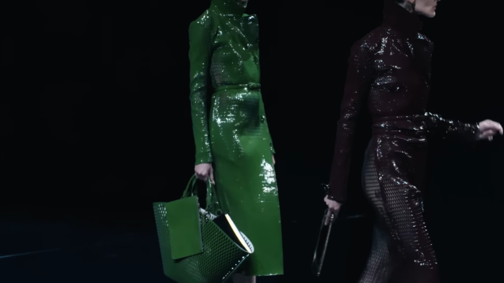 ブラック、マルーン、ライムグリーンの光沢のあるパテントレザー素材のドレスの3つの同系統のルックでファーストルックを飾った。