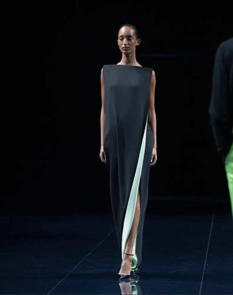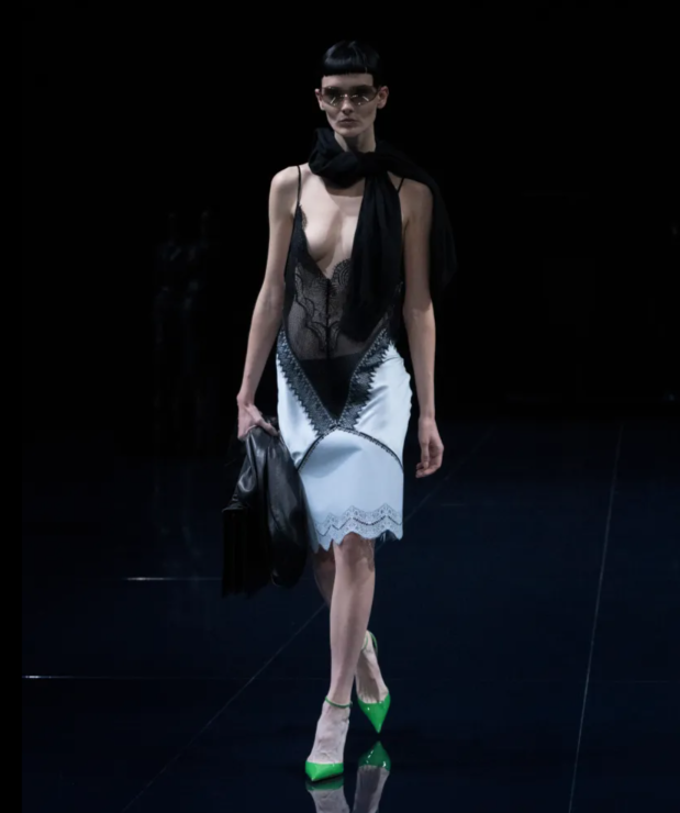そのほかにもホワイトのテラードジャケットにカシミアのセーターを羽織ったスタイル、黒の透け感のあるレースの縁取りのスリップとスカイブルーのスカート、ミントグリーンとブラックのカラーでドレープ感のあるガウンなどが注目のルックである。