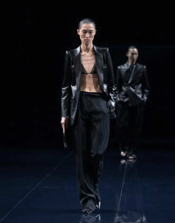 Haider Ackermannが「彼は夜の街、私は翌朝。私たちのダンスがここから始まる」と説明したように、Tom Fordらしい凛々しい男性的な要素に可憐な女性的な要素が補完されていた。