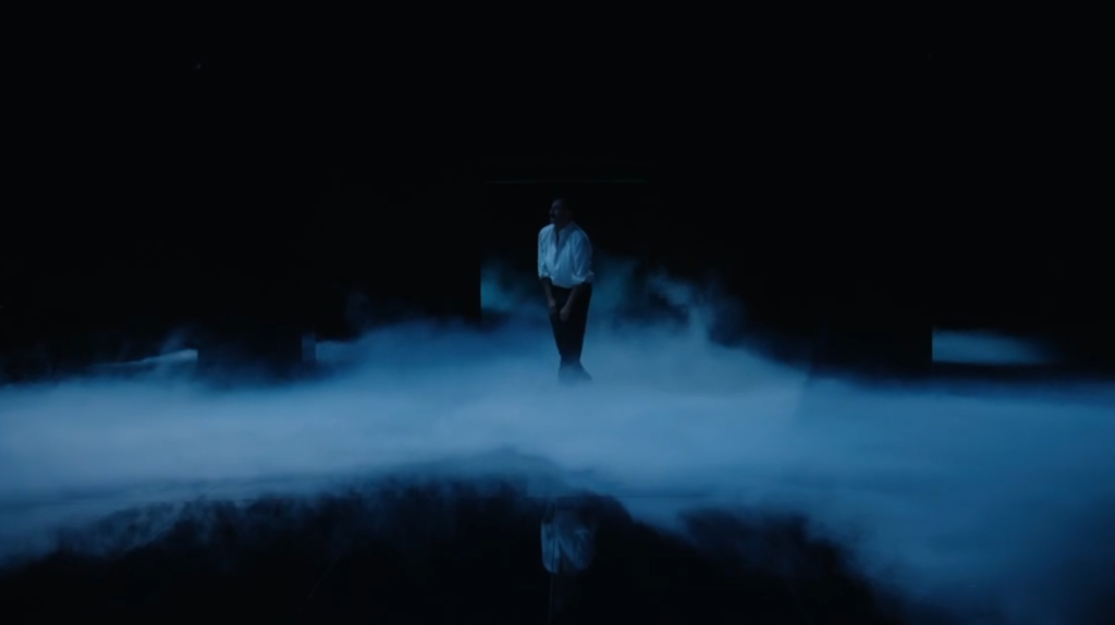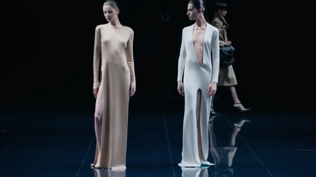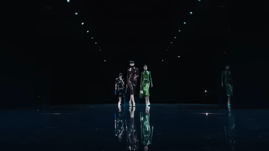 映画のような真黒の背景にランウェイが明るく照らされて鏡面のような床にそこを歩くモデルの姿が反射して映るようなスタイリッシュな空間でファッションショーが実施された。